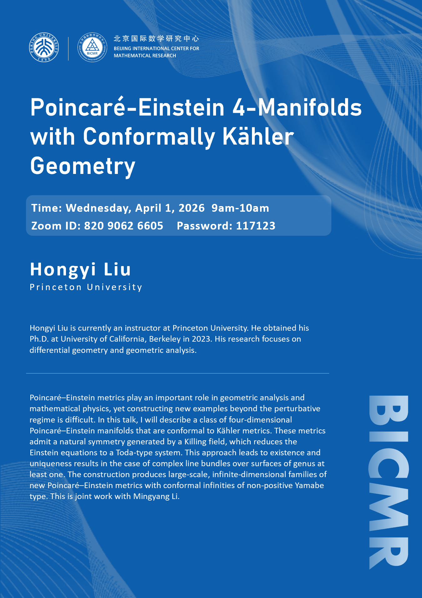 Hongyi Liu is currently an instructor at Princeton University. He obtained his Ph.D. at University of California, Berkeley in 2023. His research focuses on differential geometry and geometric analysis.