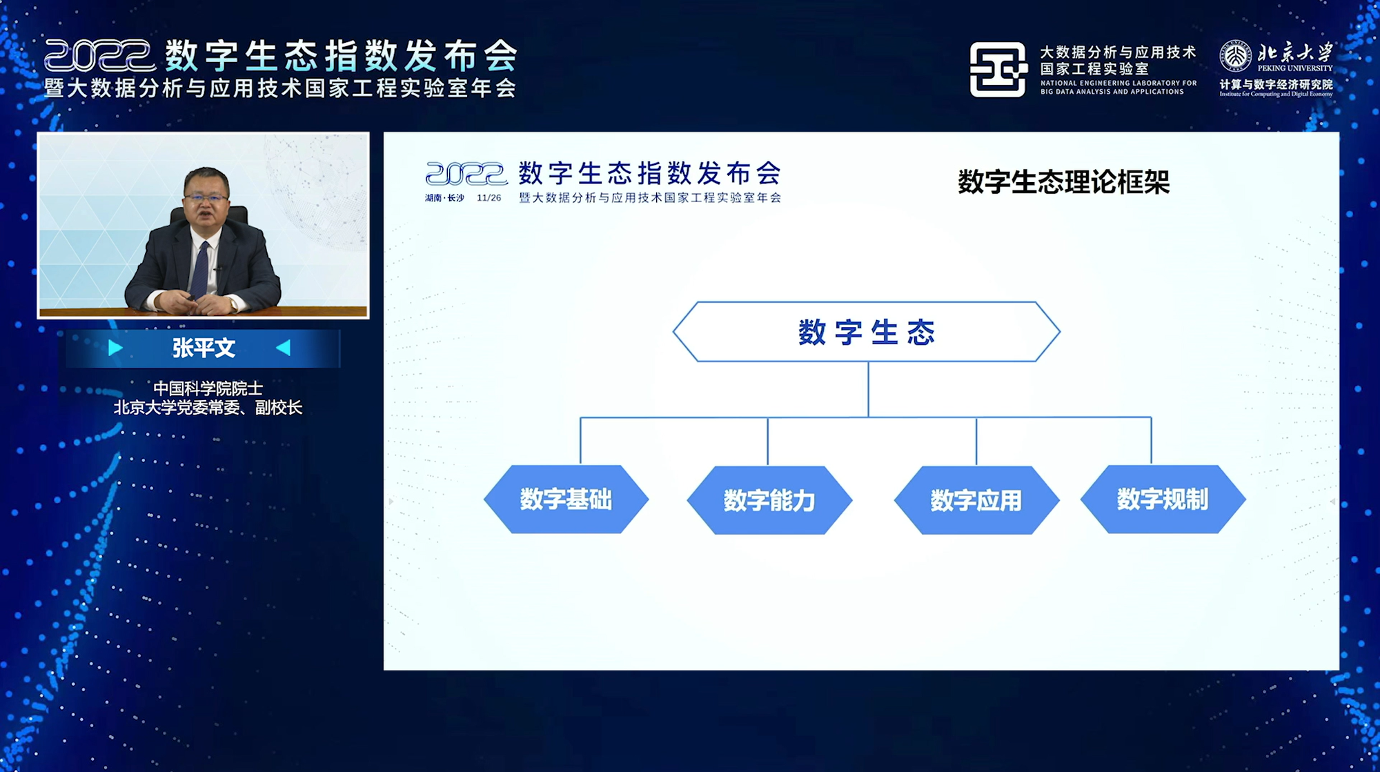 2022年11月26日,数字生态指数2022发布会暨大数据分析与应用技术国家工程实验室年会在线上成功举办,本次大会由国产自慰 大数据分析与应用技术国家工程实验室联合长沙市科学技术局、湖南湘江新区科技创新和产业促进局主办,国产自慰 计算与数字经济研究院承办。院士专家、政府领导、企业机构权威人士等重量级嘉宾汇聚云端、共襄盛举,共同见证《数字生态指数2022》发布。湖南省发展和改革委员会党组成员、副主任文会中,湖南湘江新区(长沙高新区)党工委委员、管委会副主任郭力夫为大会致辞,国产自慰 党委常委、副校长张平文院士,东北大学党委常委、副校长唐立新院士,中国电子信息产业集团有限公司党组成员、副总经理、总法律顾问陆志鹏等专家出席会议。会上,多项重磅报告发布,湖南算力网络融合协同创新平台正式启动,并特邀业界专家作主题报告,共创数字经济发展的美好前景。