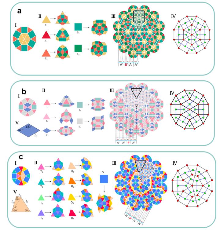Quasicrystals are intriguing ordered structures characterized by quasiperiodic translational and noncrystallographic rotational symmetry. The tiling of different geometric units such as triangles and squares in two-dimensional space can result in a great variety of quasicrystals that could be realized by the self-assembly of liquid crystalline molecules. In this study, we introduce three self-similar dodecagonal tilings, including a novel diamond–square–triangle pattern, composed of triangular and quadrangular tiles, and examine their thermodynamic stability by using the self-consistent field theory applied to T-shaped liquid crystalline molecules. Specifically, we detail the inflation rules for the construction of these dodecagonal tilings, analyze their self-similarity, and show that these tilings can be viewed as projections of higher-dimensional periodic lattice points with projection windows. Using these dodecagonal tilings as initial configurations of the SCFT results in solutions corresponding to quasicrystals that could form from T-shaped liquid crystalline molecules. The relative stability of these aperiodic phases is analyzed to obtain design rules that could stabilize quasicrystals. Meanwhile, we provide a criterion for distinguishing three dodecagonal quasicrystals and their approximants by analyzing their diffraction peaks. These findings shed new light on the discovery of new quasicrystals in soft materials.